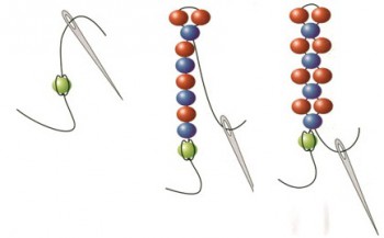 2. Набираете еще три бусинки и проводите иголку в третью бисеринку – через одну с начала ряда.