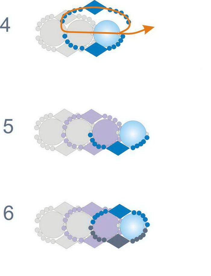 4. Для плетения второго ряда используем мозаичный принцип. Нанижите бисеринку – пропустите ее через первую бусинку, следующую – через третью, потом через пятую, через седьмую.