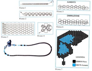 Еще одна интересная техника. Плоский жгут делают очень широким - минимум в двадцать бисерин. Выберите понравившуюся схему и нанизывайте на леску бисерины в правильной последовательности.