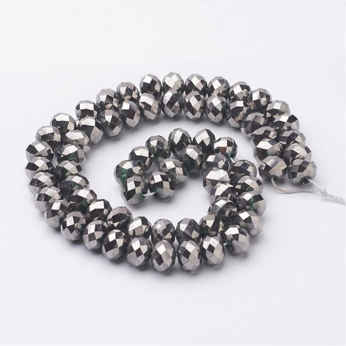 Бусины Гальваника Стекло, с серебристым Покрытием, Граненые, Рондель, Цвет: Серебро, Размер: 8х6мм, Отв-тие 1мм, около 72шт/42см/нить, (БА000001147)