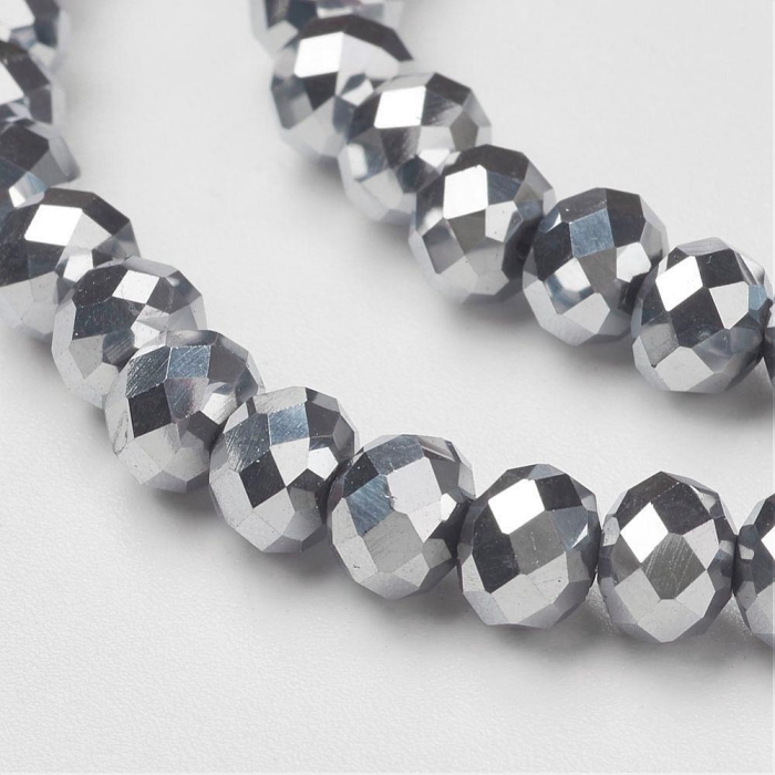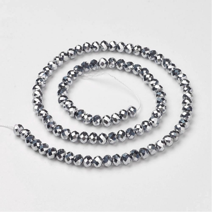 Бусины Гальваника Стекло, с серебристым Покрытием, Граненые, Рондель, Цвет: Серебро, Размер: 6х4мм, Отв-тие 1мм, около 98шт/46см/нить, (БА000001148)