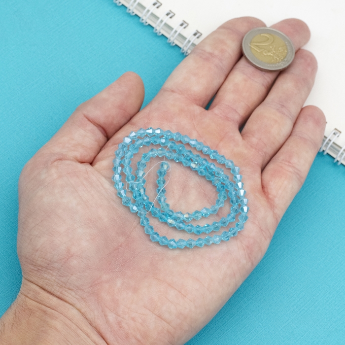 Бусины Гальваника Стекло АВ-Цвет, Граненые, Биконус, Цвет: Голубой, Размер: 4х4мм, Отв-тие: 1мм, около 87шт/33.5см/нить , (УТ000007097)
