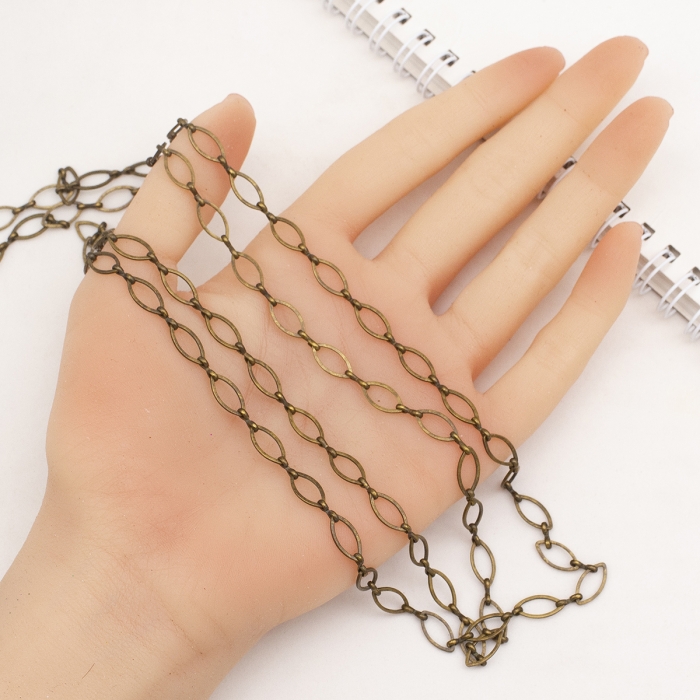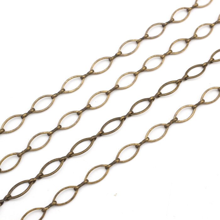 Цепь выполнена из латуни и отличается уникальным дизайном звеньев «маркиз» — удлинённых овальных звеньев, напоминающих популярную огранку драгоценных камней. Ручная работа придаёт изделию индивидуальность, а отсутствие пайки обеспечивает гибкость конструкции, что упрощает её настройку и использование. Отделка цепи, представленная в состаренном или бронзовом стиле, добавляет изделиям винтажный, деревенский или ретро-образ. Благодаря этим характеристикам цепь идеально подходит для творчества, декора и ювелирных изделий.