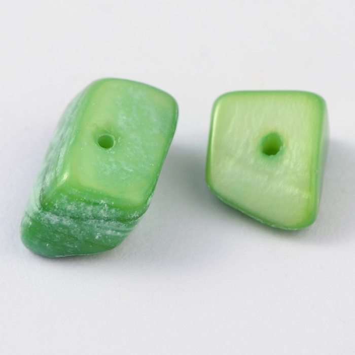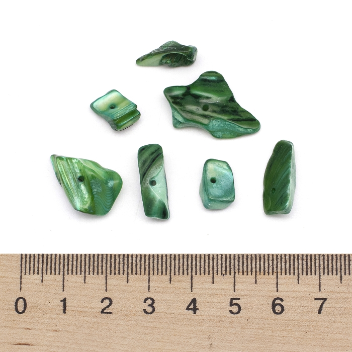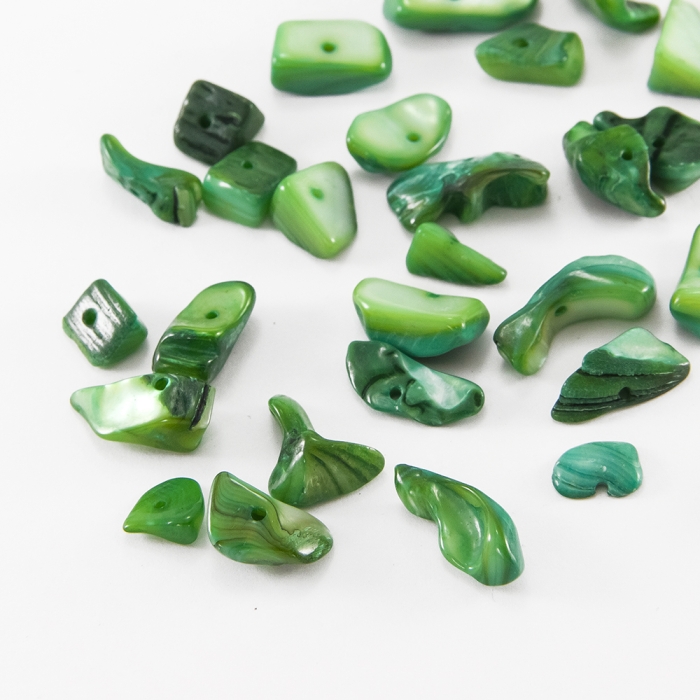 Бусины выполнены из натурального пресноводного перламутра в виде мелких, аккуратно отшлифованных кусочков. Окрашенные в насыщенный зеленый цвет, они придают изделиям живость и природную свежесть, сохраняя при этом характерный перламутровый блеск. Каждый фрагмент уникален по форме и размеру, что делает украшения с такими бусинами неповторимыми.