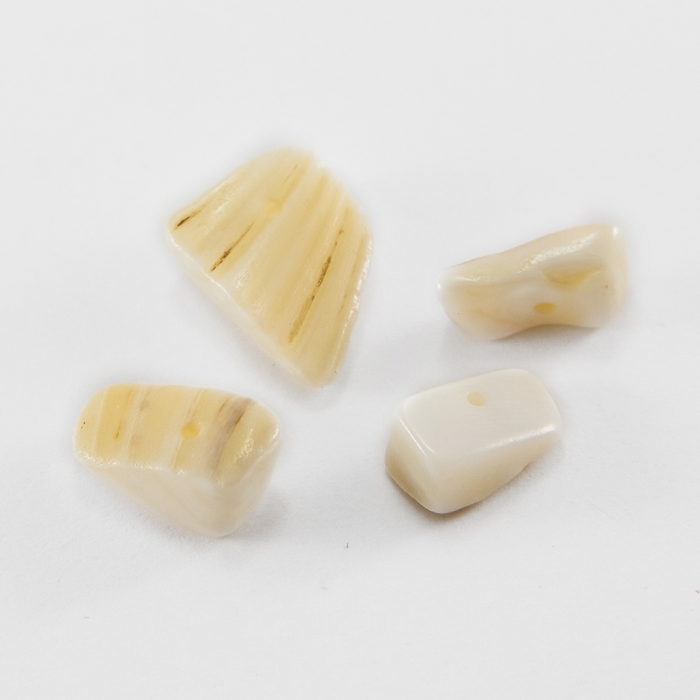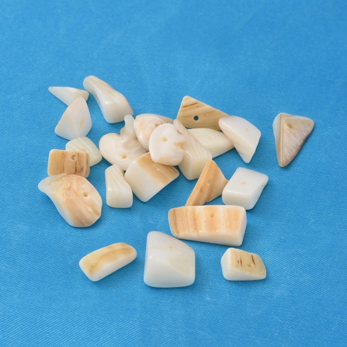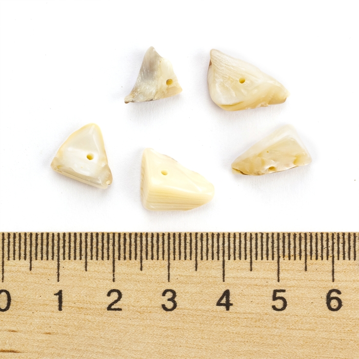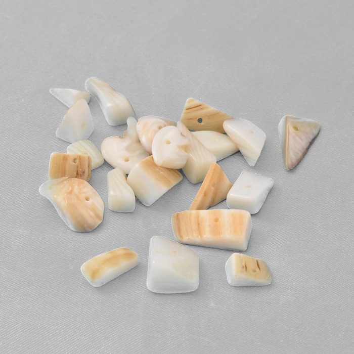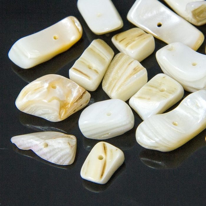 Бусины выполнены из натурального пресноводного перламутра, аккуратно отшлифованные до мелких кусочков и окрашенные в элегантный цвет слоновой кости. Нежный оттенок, сочетающийся с естественным перламутровым блеском, придаёт бусинам утончённость и универсальность для использования в различных стилях украшений.