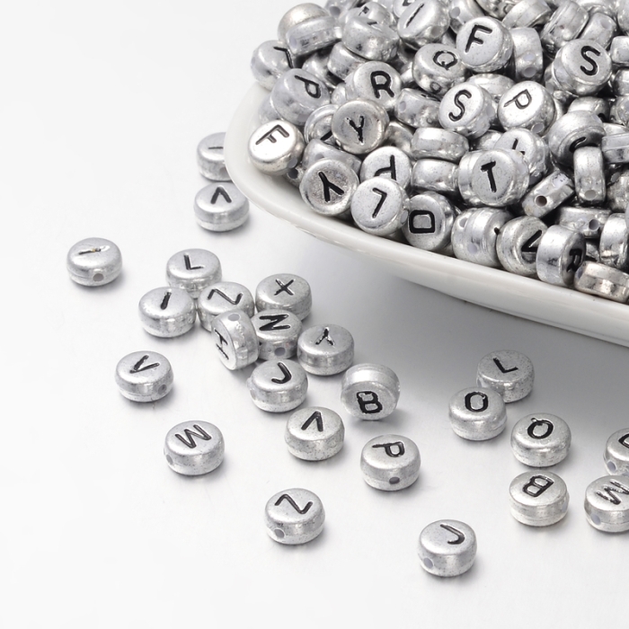Бусины Акрил Буквы Микс, Круглые Плоские, Цвет: Серебро, Размер: 7x3.5мм, Отверстие 1мм, около 175шт/25г, (УТ100013107)