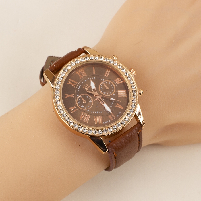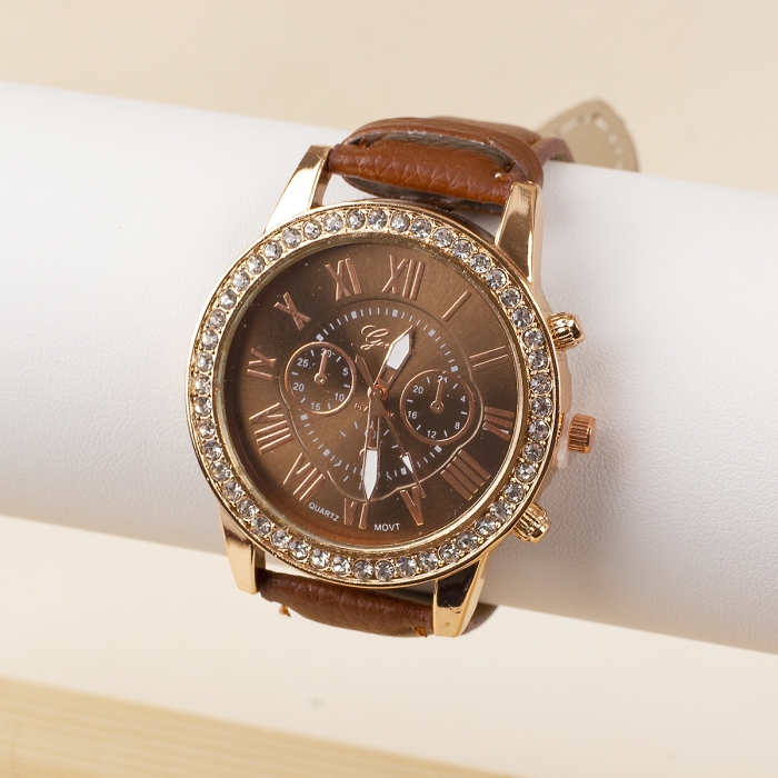 Часы Женские из Сплава со Стразами, Кварцевые, Ремешок из Кожзама, Цвет: Коричневый, Диаметр 40мм, Длина Ремешка 229мм, (УТ100016625)
