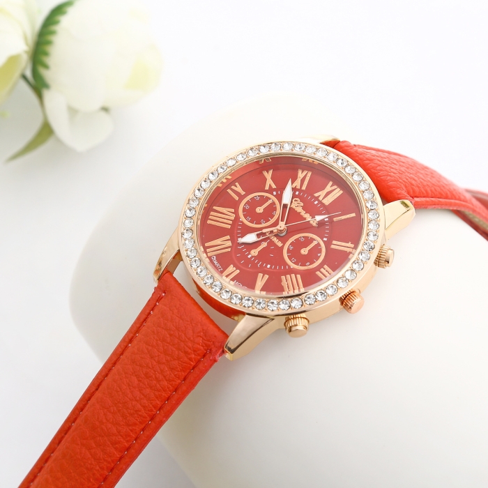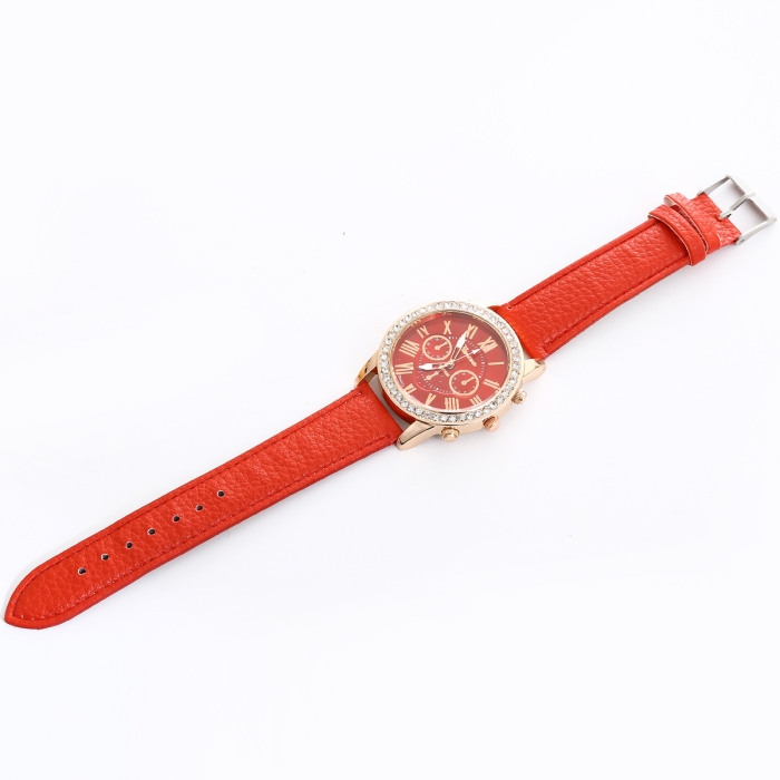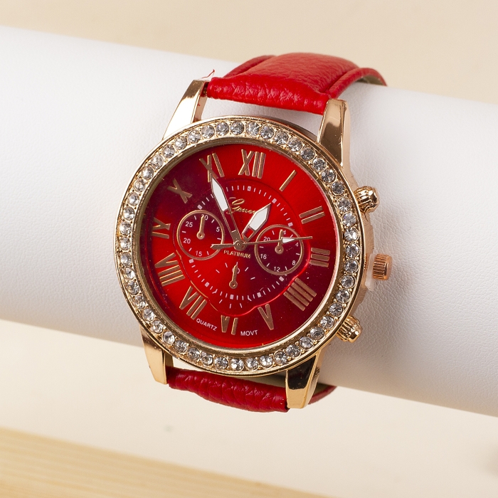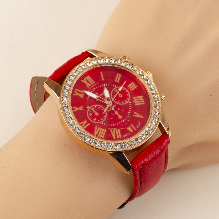 Часы Женские из Сплава со Стразами, Кварцевые, Ремешок из Кожзама, Цвет: Красный, Диаметр 40мм, Длина Ремешка 229мм, (УТ100016626)