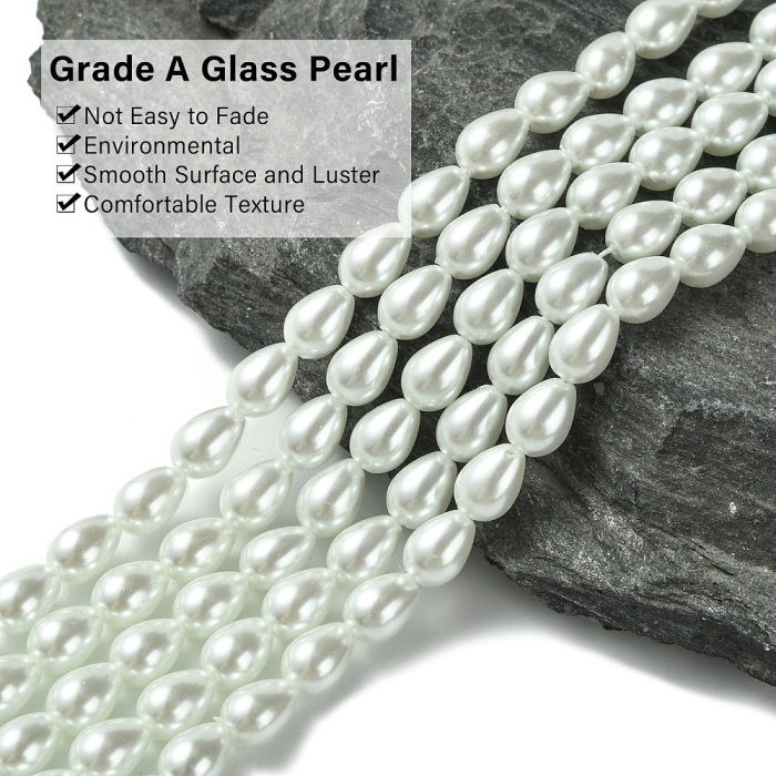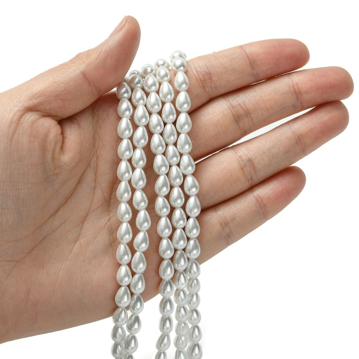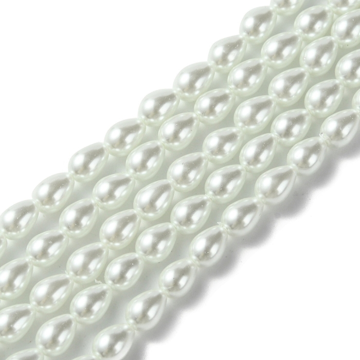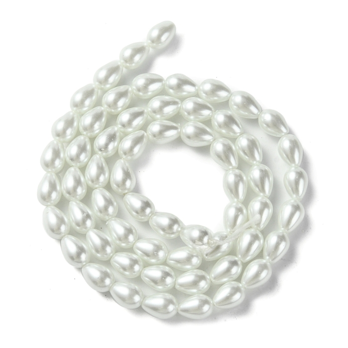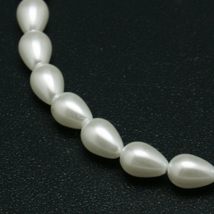 Жемчуг Бусины Стекло, Глянец, Окрашены Экокраской, Капля, Цвет: Белый, Размер: 7х5мм, Отв. 1мм, около 53шт/38см/нить, (УТ100020983)