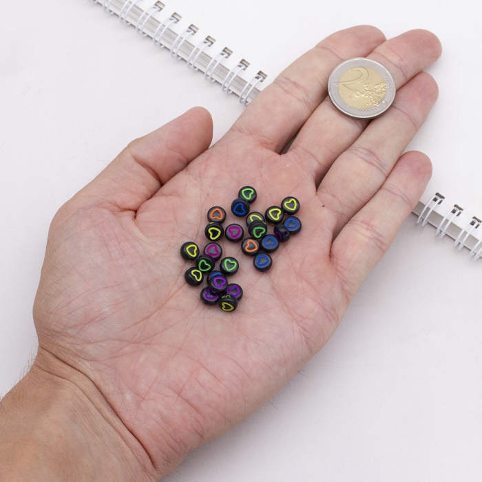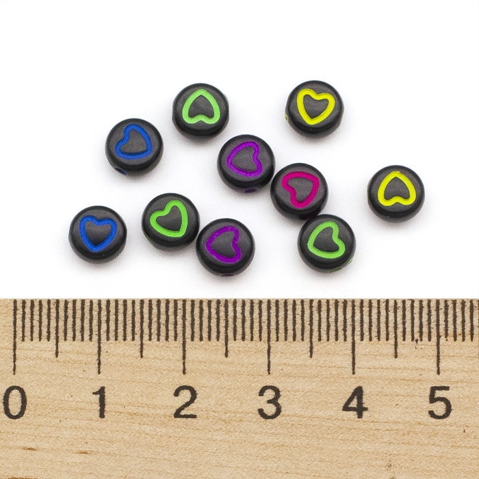 Бусины акрил Крафт стиль, круглые плоские черные с разноцветными сердцами.