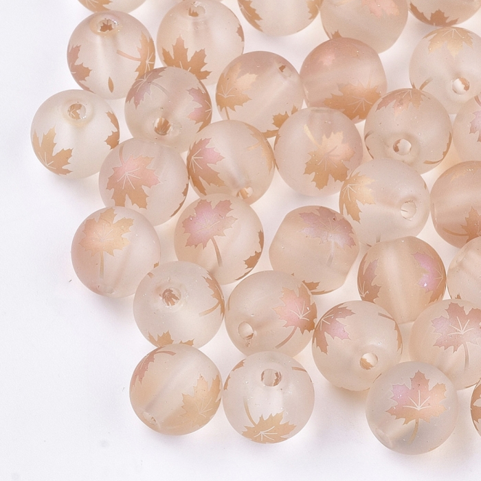 Бусины Гальваника Стекло, Круглые, Матовые с Рисунком Кленовый Лист, Цвет: Темно Лососевый, Диаметр 8-8.5мм, Отв-тие 1.5мм, (УТ100026159)