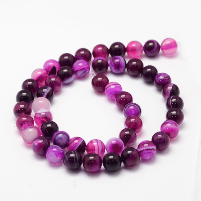 Круглые бусины выполнены из натурального полосатого агата класса А. Камни класса А отличаются высоким качеством, минимальным количеством дефектов и глубокими природными узорами. Бусины из агата имеют ярко выраженные полосы и чистую текстуру, что делает их особенно привлекательными для создания высококлассных украшений. Благодаря процессу термоокрашивания, камни приобретают насыщенные оттенки розового, фиолетового и бордового, которые подчёркивают природную красоту полосатого агата. Агат считается камнем гармонии, защиты и внутреннего баланса. Он помогает снизить уровень стресса, укрепляет эмоциональную устойчивость и способствует концентрации. Полосатый агат также усиливает интуицию и помогает владельцу достичь внутреннего спокойствия и уверенности.