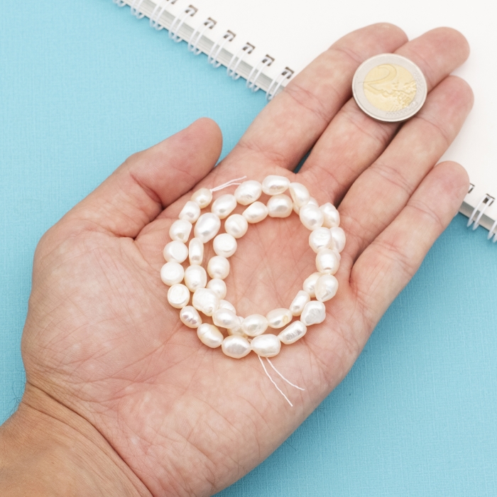 Натуральный пресноводный жемчуг - это жемчужина, которая образуется в пресноводных моллюсках, таких как устрицы или мидии, имеет разные формы, размеры. Он используется для создания ювелирных изделий, таких как ожерелья, браслеты, серьги и кольца. Эти бусины красивый и элегантный материал, который добавляет роскошь и изысканность в любой дизайн или украшение.