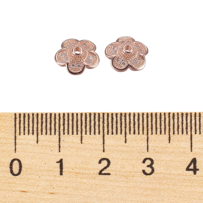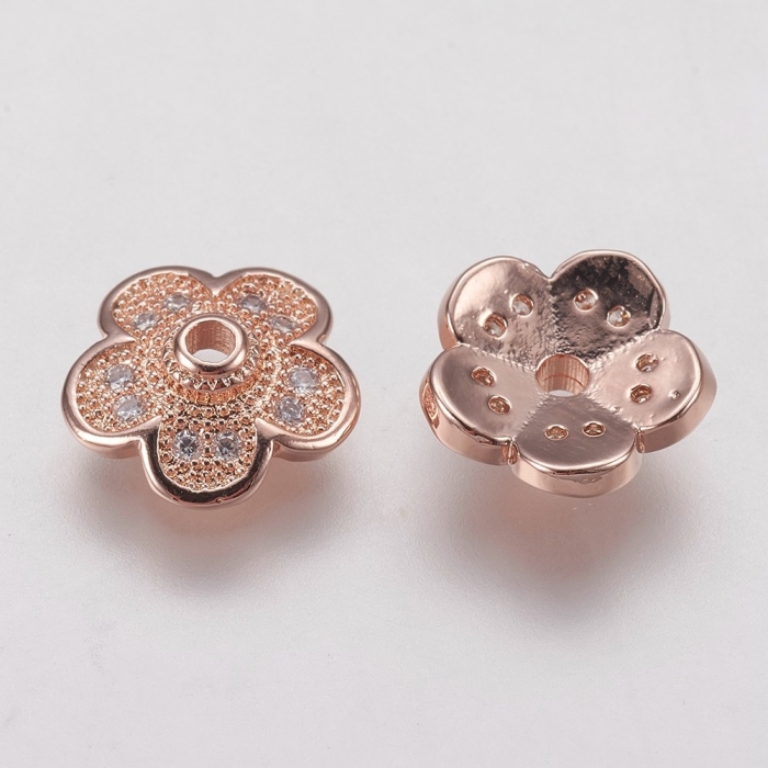 Шапочки для Бусин из Латуни. с Фианитами, Цветок, 5ленестков, Цвет: Розовое Золото,