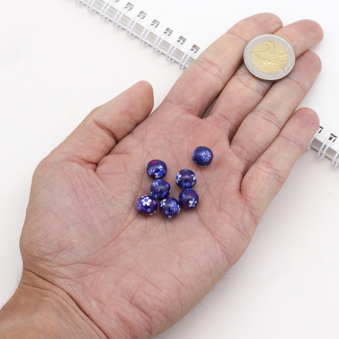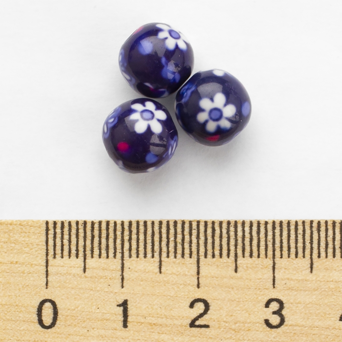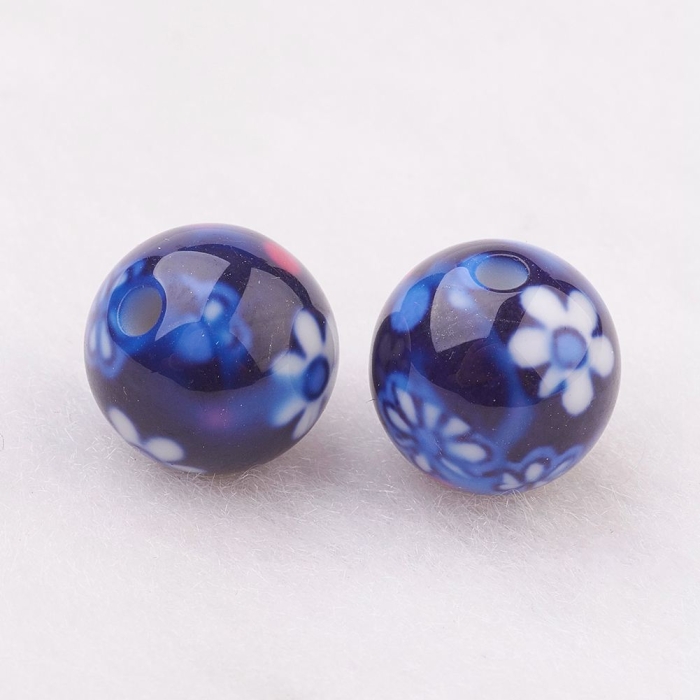 Бусины Смола, Круглые, с Цветочным Узором, Цвет: Темно-синий, 10мм, Отверстие 2мм, 10шт/упаковка, (УТ100029520)