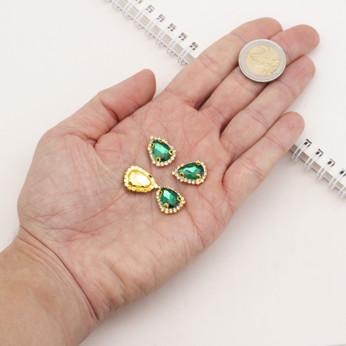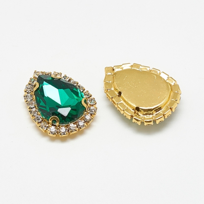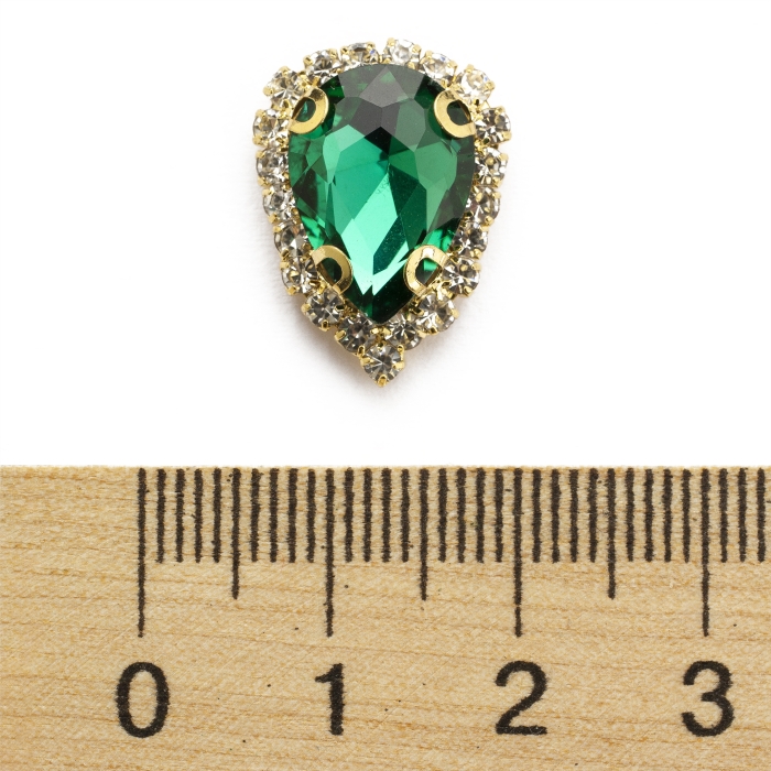 Пришивные Стразы, Стекло Горный Хрусталь, Основа Латунь, Капля, Изумруд, Размер: 19х14.5х7мм, Отв. 1мм, (УТ100029878)