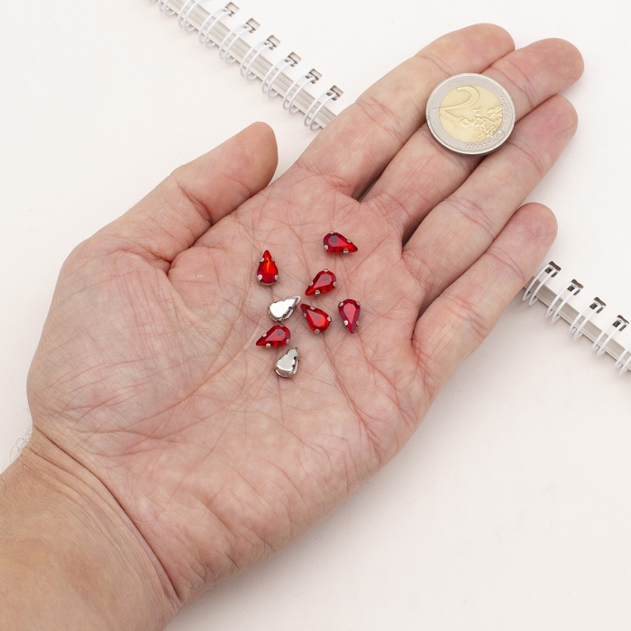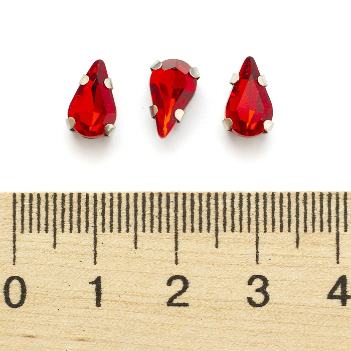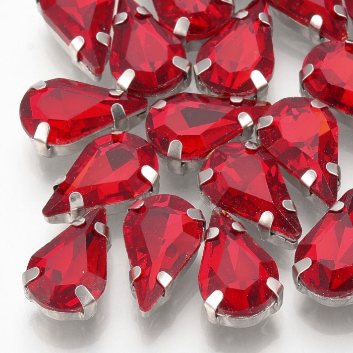Пришивные Стразы Стекло, Горный Хрусталь, Основа Латунь Цвета Платина, Капля, Цвет: Красный, Размер: 10x6.5x4.4мм, отв 0.8-1мм, (УТ100029882)