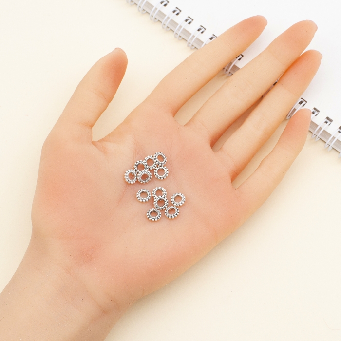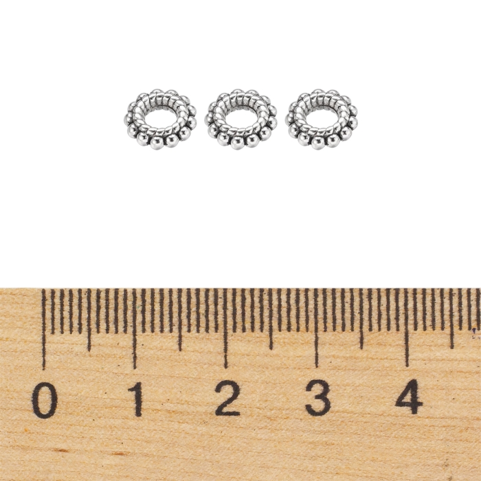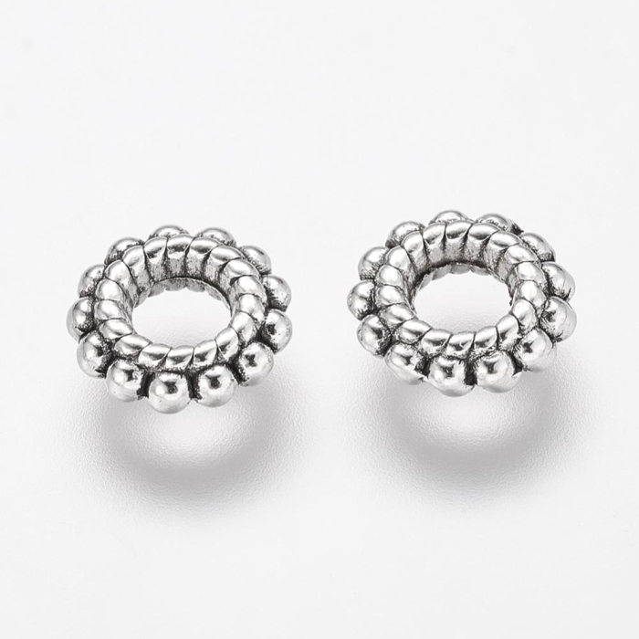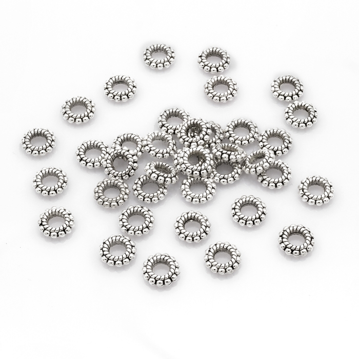 Декоративные бусины в форме пончика из цинкового сплава — отличный элемент для создания украшений в этническом, богемном или винтажном стиле. Рельефная текстура и серебристое покрытие придают бусинам выразительный вид и акцентируют внимание в изделии. Выполнены в тибетском стиле, что делает их идеальными для создания амулетов, талисманов и украшений с восточной эстетикой.