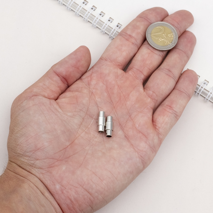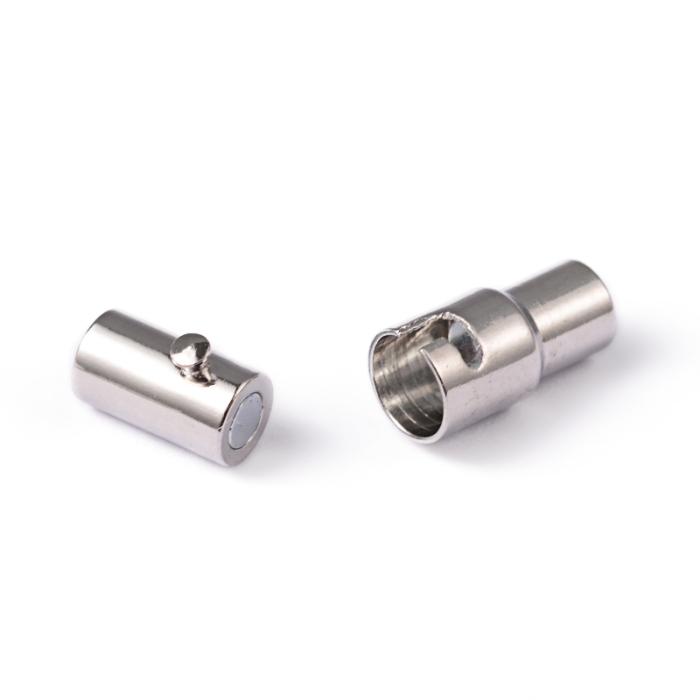 Магнитная застежка из латуни в форме трубки — это практичный и аккуратный элемент фурнитуры, состоящий из двух частей, которые соединяются за счёт встроенных магнитов. Для надёжной фиксации шнура или нити концы изделия закрепляются внутри застежки с помощью клея. Латунь придаёт застежке эстетичный внешний вид и устойчивость к износу.