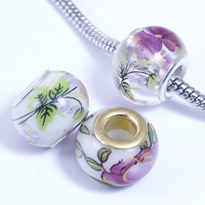 Шармы Евробусины Стеклянные, Роспись Лист, Вставка из Латуни цвета Серебро и Золото, Рондель, Микс, 14.5x11мм, Отверстие 5мм, (УТ0028968)