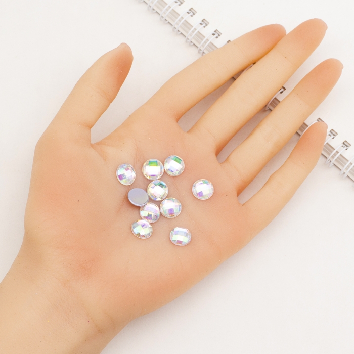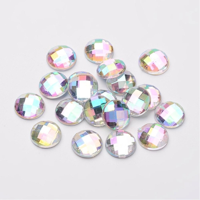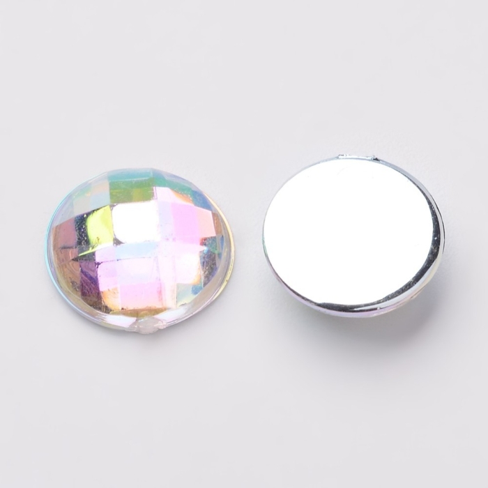 Акриловые Кабошоны Граненые Плоские - декоративные элементы, выполненные из акрила, имитирующего блеск и сияние драгоценных камней. Их яркая граненая поверхность привлекает внимание и создает эффект дорогостоящих материалов, при этом оставаясь доступными по цене. Цвет Кристалл АВ (Aurora Borealis) является одним из самых популярных — это прозрачные кристаллы с радужным покрытием, создающим многогранный световой эффект, подобный северному сиянию, что добавляет стразам дополнительное сияние и глубину.