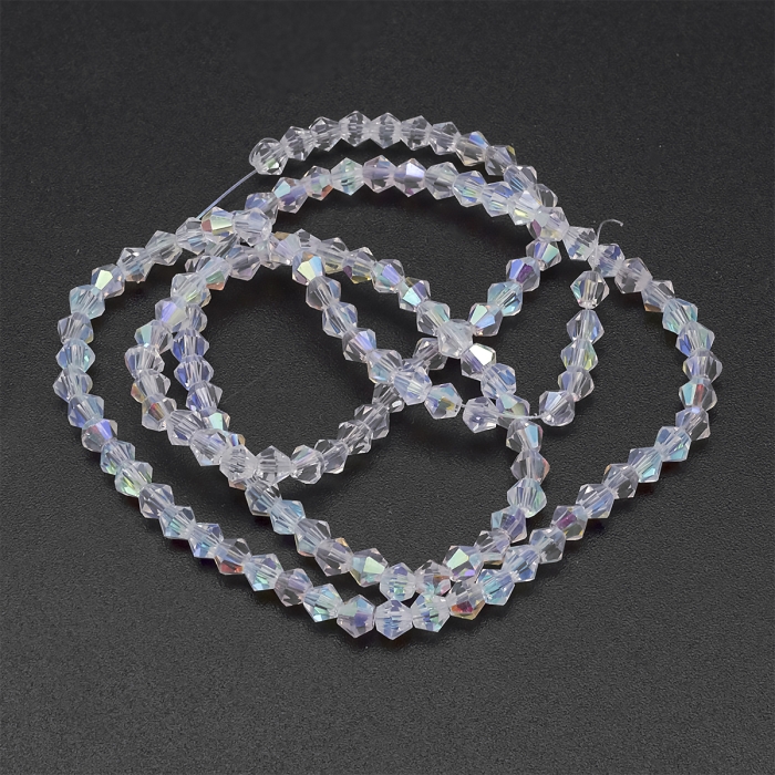Стеклянные бусины в форме биконуса с имитацией австрийского хрусталя имеют высококачественную огранку и двойную AB-покрытие, создающую красивый радужный перелив. Благодаря классу качества Grade AA, они отличаются ровной формой, чистотой и интенсивным блеском, что делает их похожими на настоящий хрусталь. Бусины нанизаны на нить, что удобно для хранения и последующего использования.