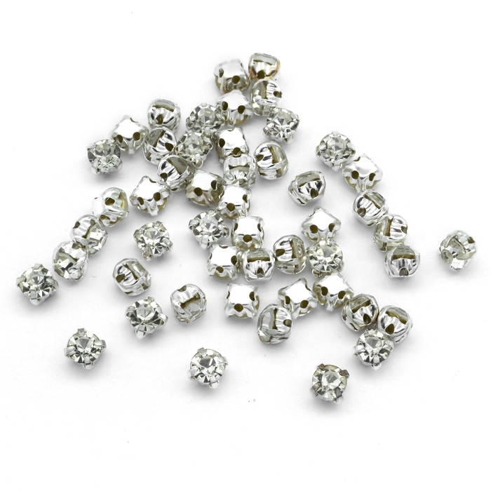 Каждый страз надёжно закреплён в прочной латунной цапе, которая обеспечивает удобство пришивания и дополнительную защиту камня. Латунные оправы устойчивы к деформации и придают украшениям аккуратный, завершённый вид.