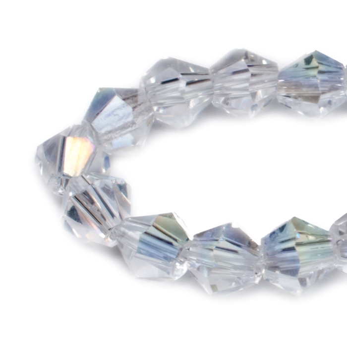 Стеклянные бусины в форме биконуса с гальваническим покрытием АВ-цвет – это утончённый материал для создания эффектных украшений и декоративных элементов. Гальваническое покрытие с радужным эффектом ("АВ" – от латинского Aurora Borealis, "северное сияние") придаёт бусинам яркий цветной перелив, который меняется в зависимости от угла освещения. Переливы напоминают бензиновую радугу и делают бусины особенно привлекательными. Благодаря технике гранения, каждая бусина обладает многогранной поверхностью, которая усиливает игру света и добавляет изделиям выразительности.