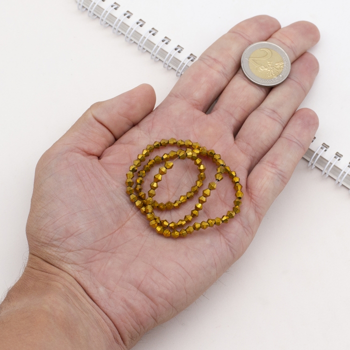 Бусины Гальваника Стекло, Биконус, Цвет: Золотистый, Размер: 4х4.5мм, Отв-тие 1мм, около 80шт/30см/нить, (УТ100013995) - ᐈ заказывайте в Москве оптом и в розницу ✅Скидки ✅Акции ✅Распродажи ᐈ доставка по всей России ᐈ Интернет-магазин Мир Бусин