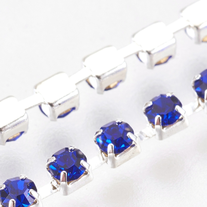 Цепь со Стразами, Латунь, Класс А, Цвет металла: Серебро, Цвет Страз: Сапфир, Ширина 2мм, около 360шт/1.1м, (УТ100017382)