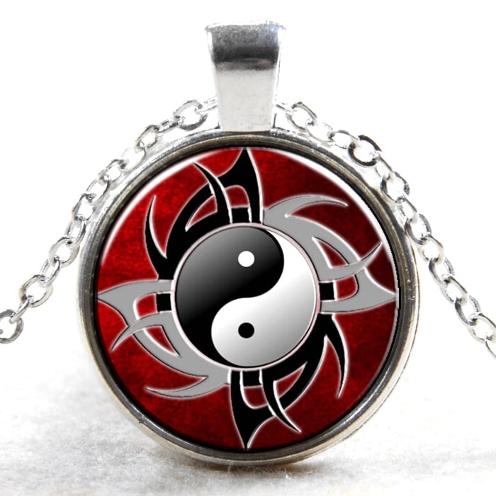 Винтажный Кулон Инь-Ян Круглый на Цепочке, Металл и Стекло, Цвет: Серебро,