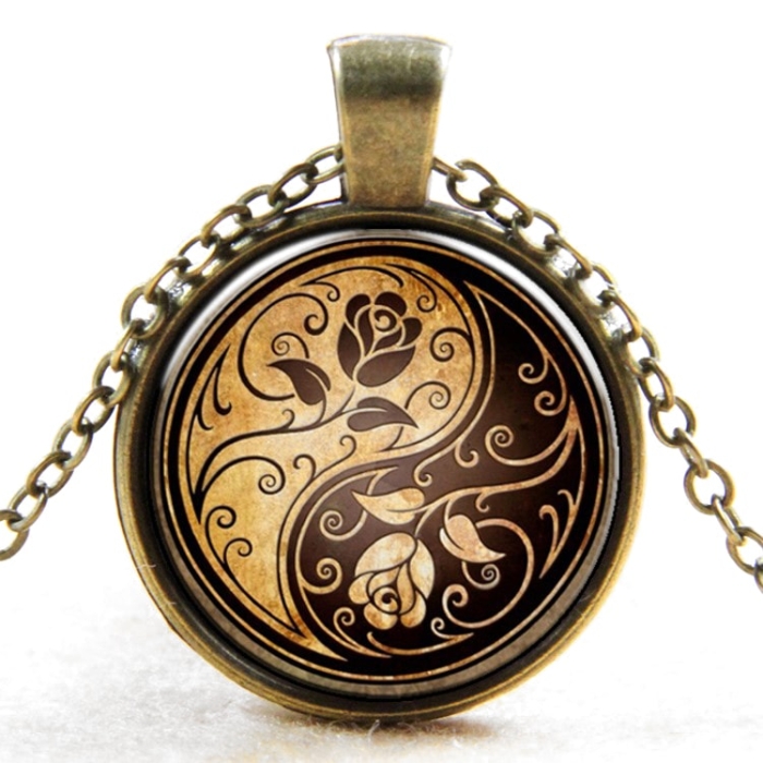 Винтажный Кулон Инь-Янь Розы круглый на цепочке, Металл и Стекло, Цвет: Бронза, Размер Цепочки: Длина 45-50см, Кулон: внешний диаметр 27мм, внутренний диаметр 25мм