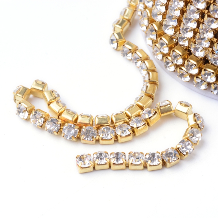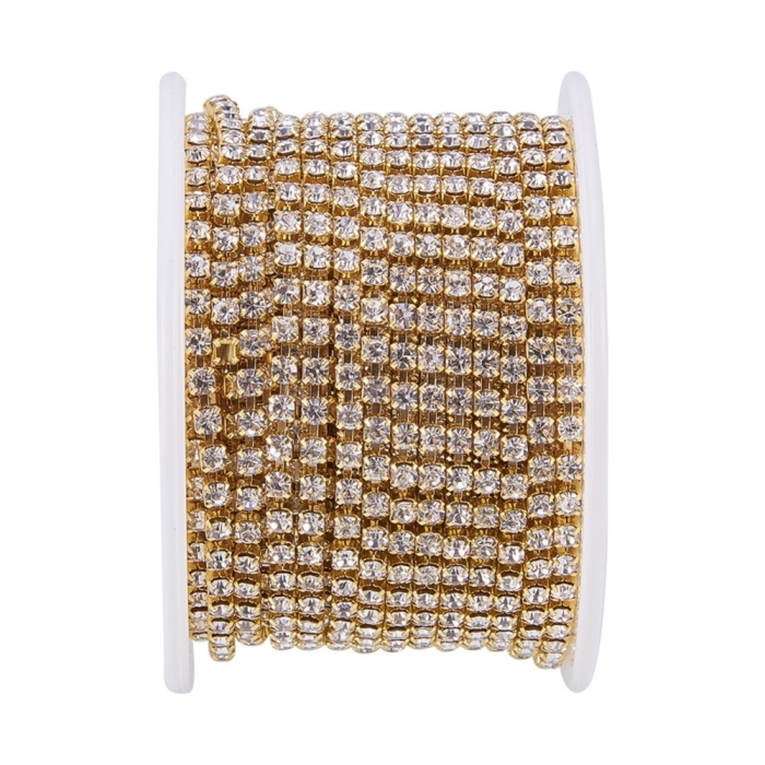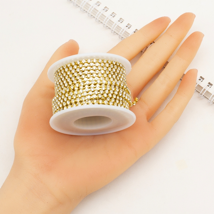 Цепь со стразами широко используется в изготовлении бижутерии, включая колье, браслеты, серьги и подвески. Она подходит для декорирования одежды, аксессуаров, сумок и обуви, добавляя им изысканности и шика. Цепь также используется в создании декоративных элементов для интерьера и различных видов рукоделия. Этот материал идеально подходит для профессионального использования в ювелирной индустрии и для любителей творчества, стремящихся создать уникальные изделия.