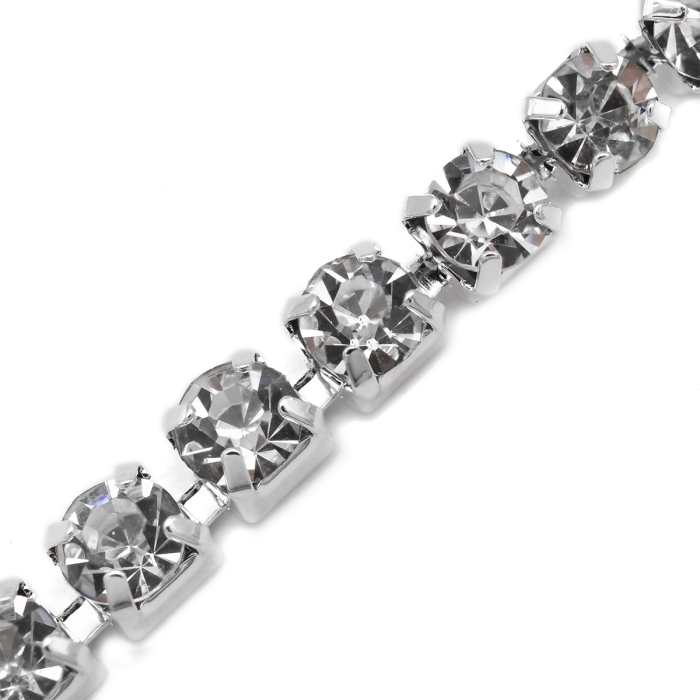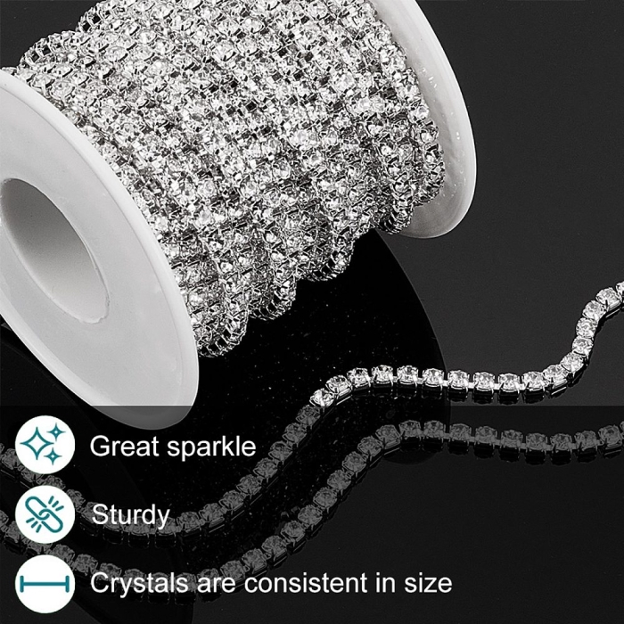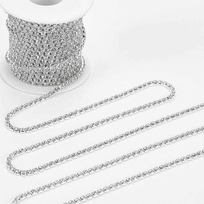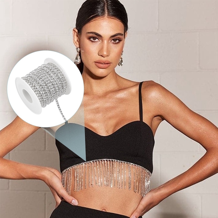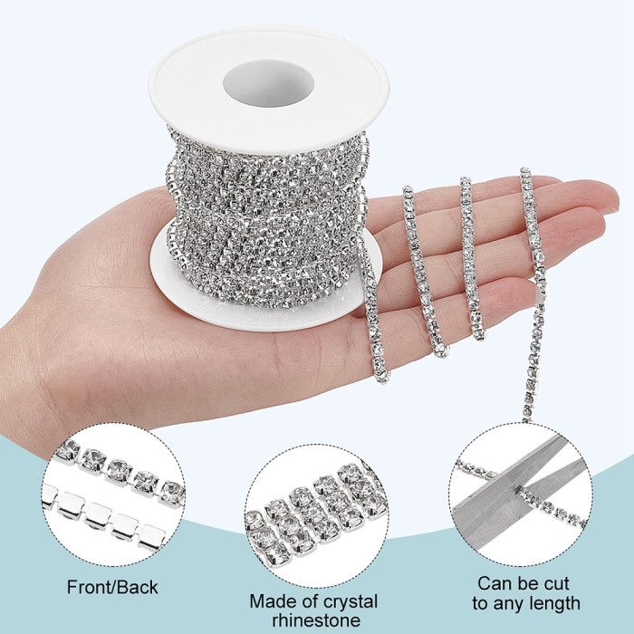 Цепь со стразами широко используется в изготовлении бижутерии, включая колье, браслеты, серьги и подвески. Она подходит для декорирования одежды, аксессуаров, сумок и обуви, добавляя им изысканности и шика. Цепь также используется в создании декоративных элементов для интерьера и различных видов рукоделия. Этот материал идеально подходит для профессионального использования в ювелирной индустрии и для любителей творчества, стремящихся создать уникальные изделия.