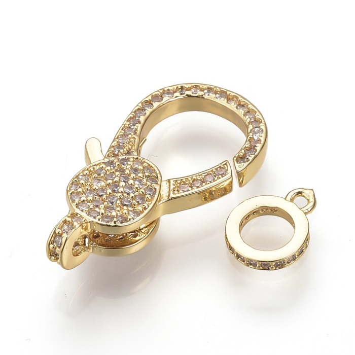 Застежка Карабин-Лобстер, Латунь с Фианитами, Цвет: Золото, Размер: 25.5х13х5.5мм, Отверстие 2мм, (УТ100026780) - ᐈ заказывайте в Москве оптом и в розницу ✅Скидки ✅Акции ✅Распродажи ᐈ доставка по всей России ᐈ Интернет-магазин Мир Бусин