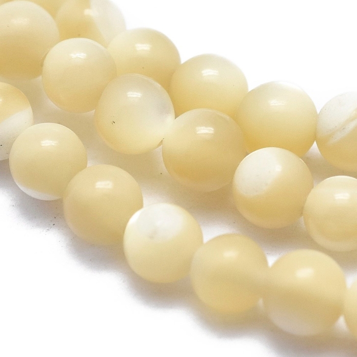Бусы из перламутра в форме гладкого шарика. Доминирующий цвет – желтый. слегка переходящий в экрю. Бусины имеют натуральные цвета и вкрапления, нитки.