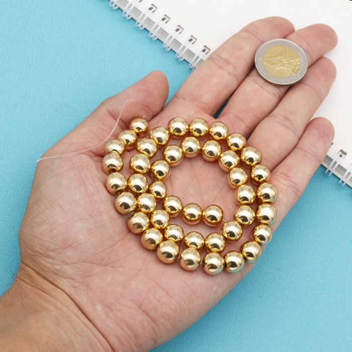 Бусины Синтетический Гематит, Немагнитный, Круглые, Гальваника, Покрытие Светлое Золото, 10х9мм, Отв. 1-1.5мм, ок. 42шт/38см/нить (УТ100029094)