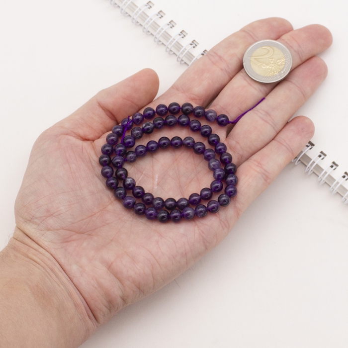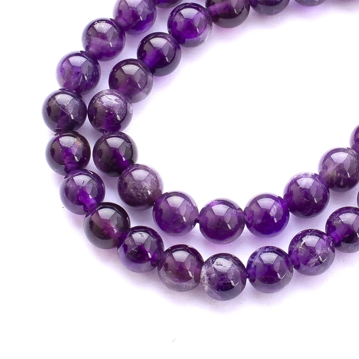Натуральные бусины из аметиста в классической круглой форме. Камень отличается благородным фиолетовым оттенком с прозрачными и насыщенными переливами, подчеркивающими его природную красоту и энергию.