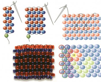 Еще одна интересная техника. Плоский жгут делают очень широким - минимум в двадцать бисерин. Выберите понравившуюся схему и нанизывайте на леску бисерины в правильной последовательности.