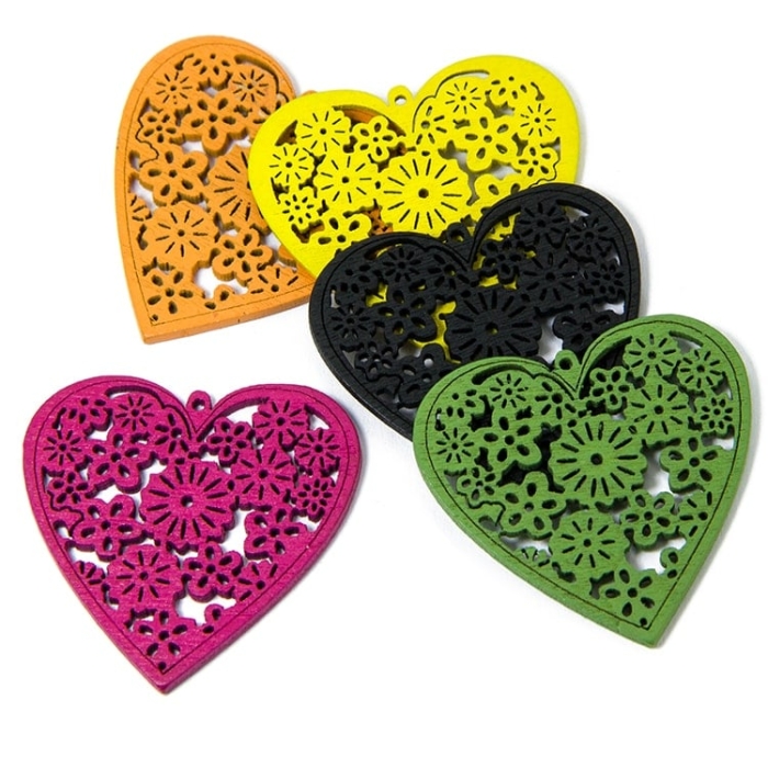 Декоративные деревянные заготовки в форме сердца с изящным ажурным цветочным орнаментом. Изготовлены из легкого натурального дерева и окрашены в яркие цвета (желтый, розовый, черный, зеленый, оранжевый). Благодаря точному лазерному резу элементы имеют аккуратную форму и аккуратные детали. Размер - 40 мм, есть небольшое отверстие для подвешивания.