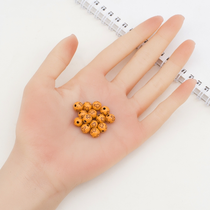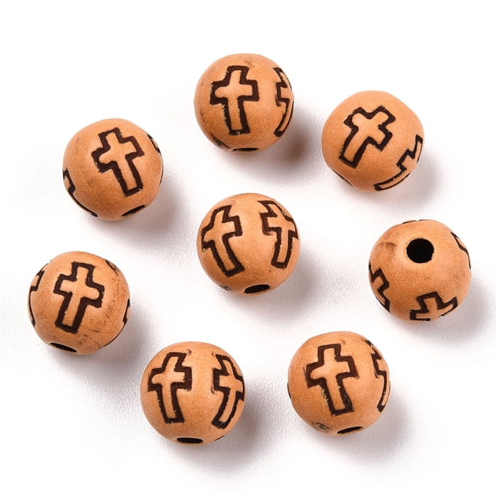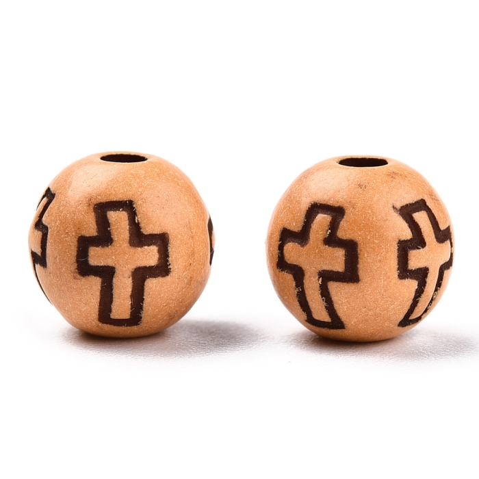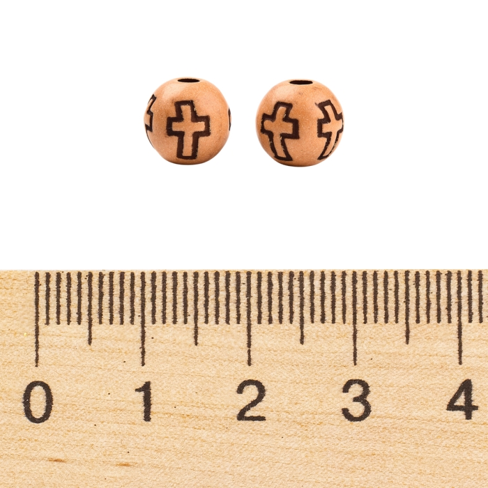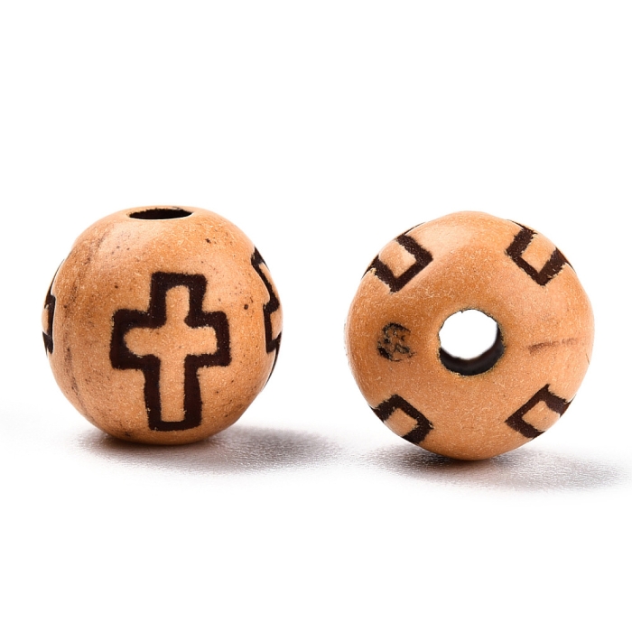 Легкие круглые бусины из акрила с имитацией древесины. Украшены узором в форме креста.