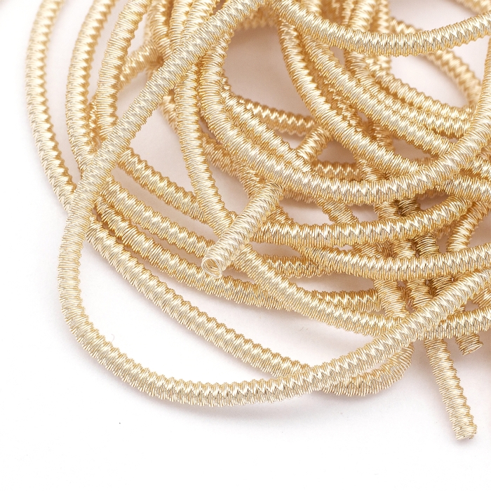 Канитель фигурная медная матовая – это декоративная проволока с уникальной текстурой и бархатистым матовым блеском, которая придаёт изделиям утончённость и изысканный внешний вид. Изготавливается путём обвития тонкой проволоки вокруг фигурной заготовки с плавным рельефом, что отличает её от трунцала с его чёткими углами. Канитель бывает с плоским или круглым сечением проволоки и выпускается в различных формах, включая витую и "зиг-заг".