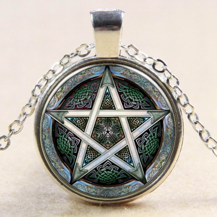 Винтажный Кулон Звезда Круглый на Цепочке, Металл и Стекло, Цвет: Серебро, Размер Цепочки: Длина 45-50см, Кулон: внешний диаметр 27мм, внутренний диаметр 25мм