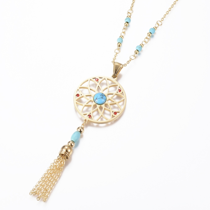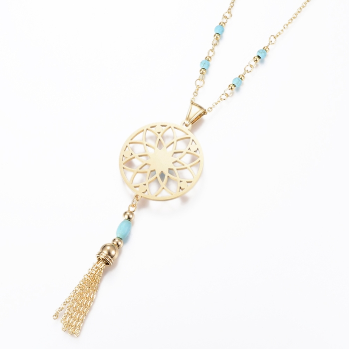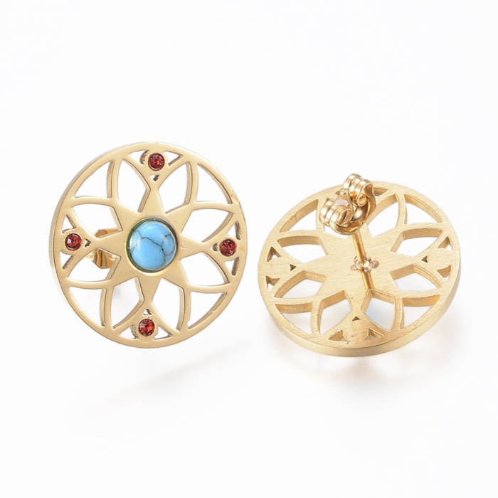Комплект ювелирных изделий из нержавеющей стали 304, Ожерелье с подвеской и Серьги-гвоздики, со стразами цвета Сиам и Синтетической Бирюзой, плоские круглые с кисточкой, Цвет металла: Золото, Размер: Ожерелье: Длина около 45 см, Ширина 2 мм, Подвеска: 112 x 35 x 8 мм, бусина: 3 ~ 5 мм, Серьги: 18x3,5 мм, штифт: 0,8 мм.