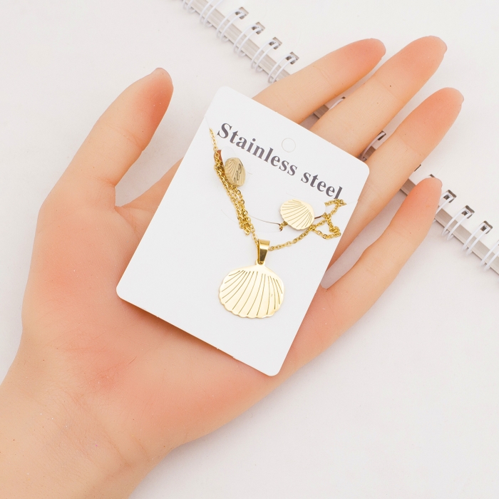 Комплект ювелирных изделий в морской тематике из нержавеющей стали включает ожерелье с подвеской и серьги-гвоздики. Дизайн вдохновлен красотой океана. Нержавеющая сталь обеспечивает долговечность, устойчивость к коррозии и гипоаллергенные свойства, а полированная поверхность придает украшениям благородный блеск.
