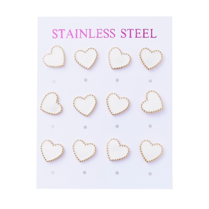 Серьги Пусеты из Нержавеющей стали 304, Сердце, Цвет: Золото с Белой Эмалью.