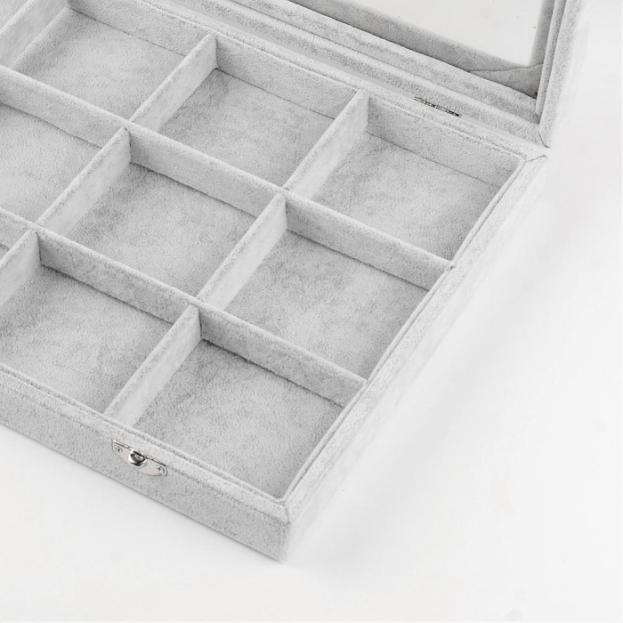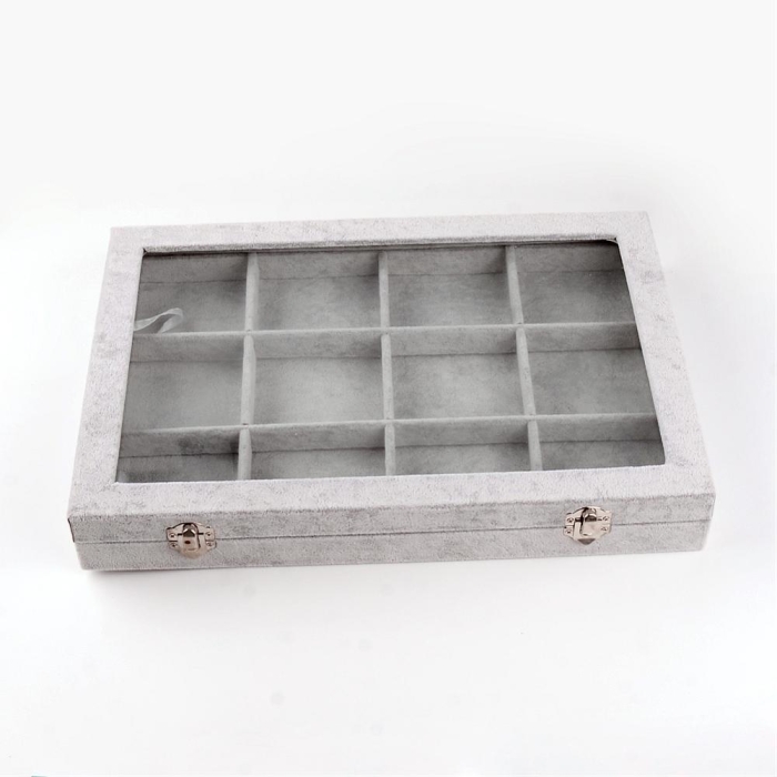 Классическая Шкатулка для Украшений, Прямоугольная, Бархатная, со Стеклянной Крышкой, Цвет: Серый, Размер: 24х35х4.5см, 12 Ячеек, (УТ100025069)