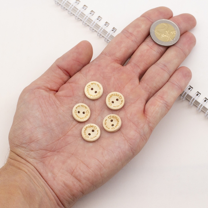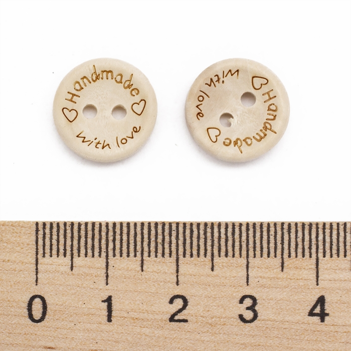 Пуговицы Круглые из Натурального Дерева на 2 Отверстия со Словами "Handmade With Love" (Ручная работа с любовью)