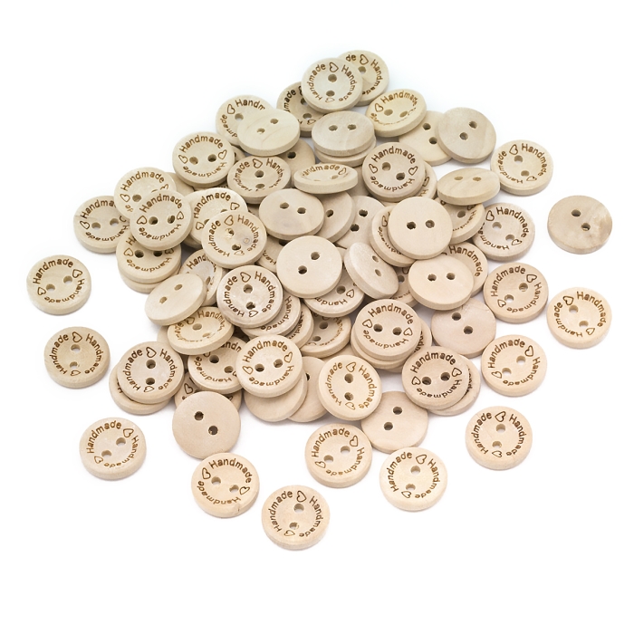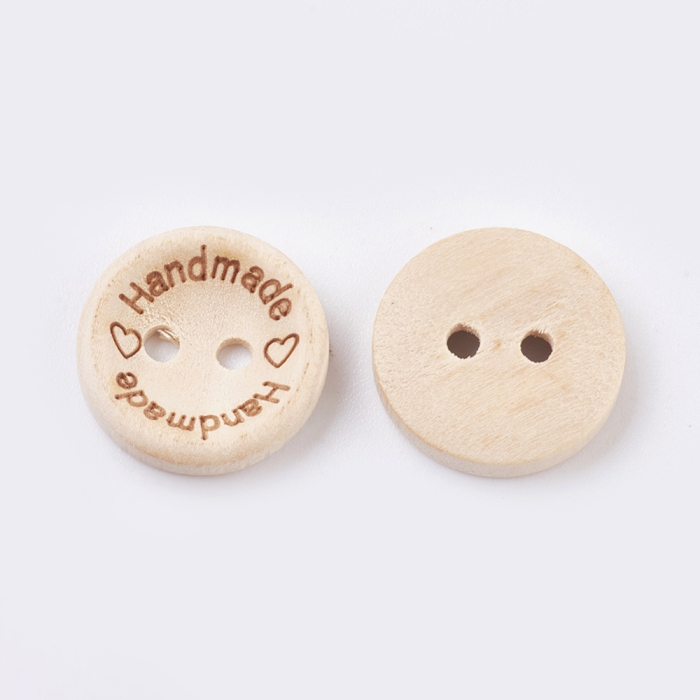 Пуговицы Круглые из Натурального Дерева на 2 Отверстия со Словами "Handmade" (Ручная работа)