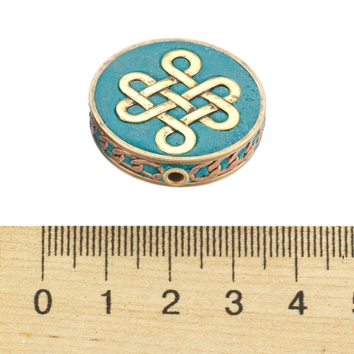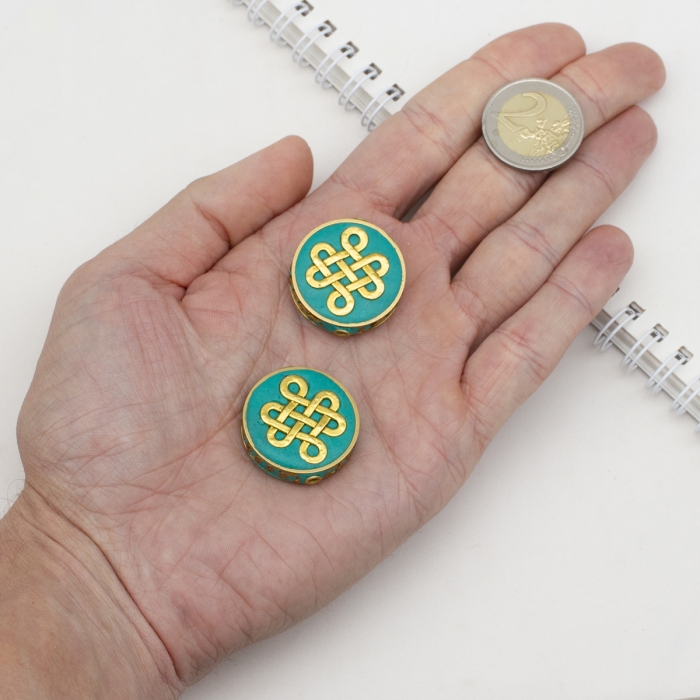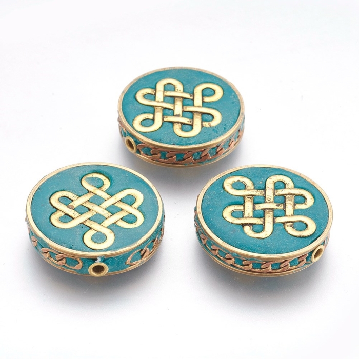 Бусины Индонезийские из Полимерной Глины и Латунной Фурнитуры, Круглые Плоские, с Китайским Узором, Ручная Работа.